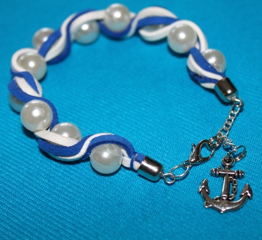 Браслет из замшевого шнура и бусин под жемчуг с подвеской-якорем символизирует морскую волну.